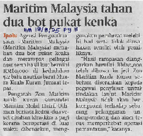 (Harian Metro, 2025-12-01)Monsun Timur Laut (MTL) yang melanda tidak dianggap sebagai satu musibah sebaliknya membuka pintu rezeki kepada nelayan Sungai Kinta di sini memperoleh pendapatan lebih tinggi berbanding kebiasaan. -
